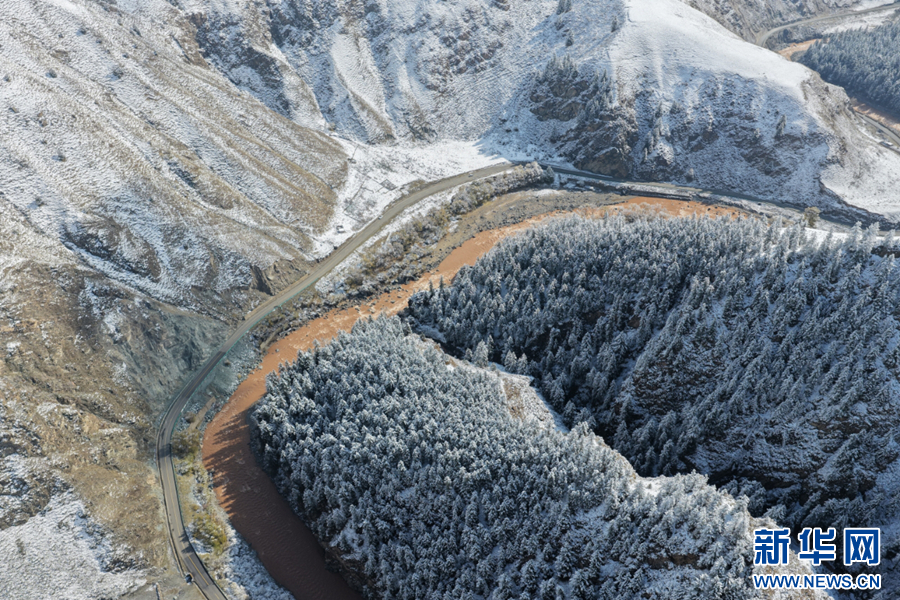 航拍雪后祁连9号公路沿线黑河峡谷风光。